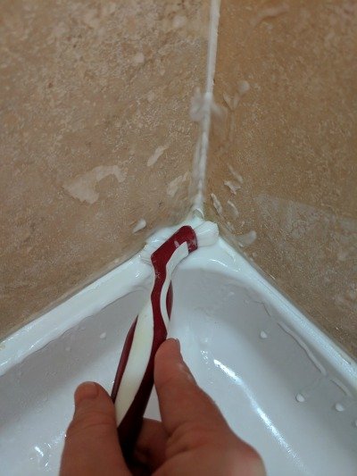 Step 7: Once the bleach mix has set over an hour then you can use the toothbrush to scrub the caulk for a minute or two.